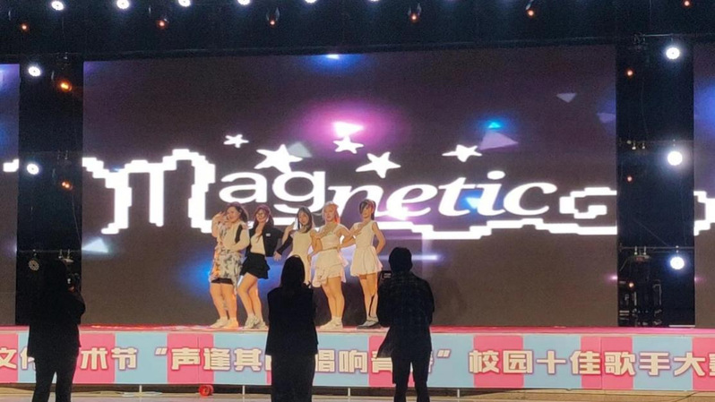 活动伊始,随着轻快的音乐《magnetic》响起,成员们开始了他们的表演。伴随着活泼富有动感的鼓点,他们的动作轻盈而有力,每一步都精准地踩在音乐的节点上,仿佛是在与音符共舞。每一个转身都如同水面上翻飞的蝴蝶,优雅而轻盈,手指在空中划过一道道优雅的弧线,仿佛是在空气中书写着诗歌,眼神中闪烁着坚定的光芒。成员们紧密配合,他们的动作如同流水般流畅,又如同火焰般热烈。他们时而相互交错,时而分离跳跃。观众们被舞者们精湛的表演深深吸引,他们的目光紧紧追随着舞者的每一个动作。他们的掌声、欢呼声与音乐声交织在一起,形成了一首美妙的交响乐。观众们与舞者们一同沉浸在这场视觉与听觉的盛宴中。