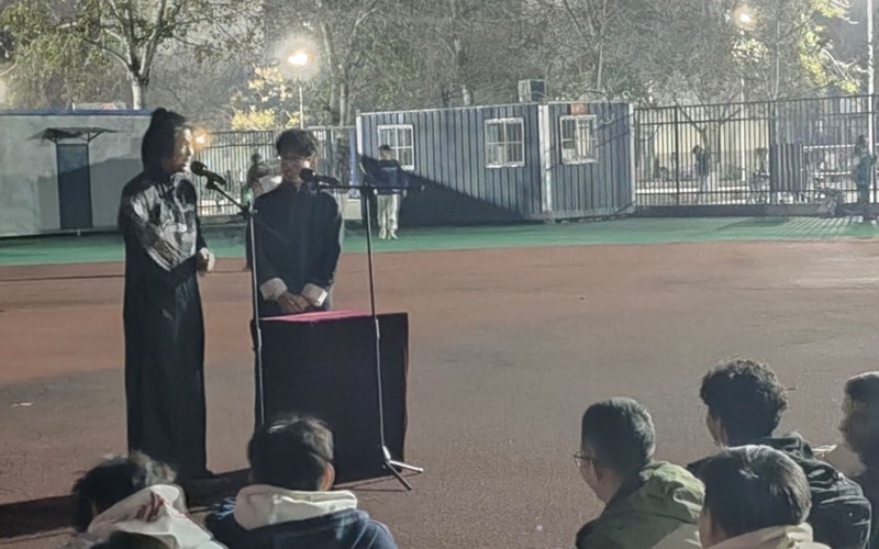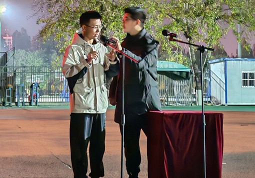 日新曲艺社演员们的登场,将现场氛围推向了高潮。董浩淼和王荣杰带来的《漫才》,以其独特的幽默风格和默契配合,逗得台下观众笑声连连,掌声不断。他们通过生动的表演和诙谐的台词,展现了漫才这一艺术形式的独特魅力,让师生们在欢笑中感受到了曲艺的别样趣味。紧接着,孙荣洁和常瑞娟的《对春联》则展现了传统曲艺的深厚文化底蕴。二人在台上你一言我一语,对起春联来妙语连珠,不仅展示了扎实的曲艺功底,更让大家领略到了春联这一传统文化瑰宝的韵味与内涵。随后,沈之涵和郭佳琪的《大保镖》同样精彩绝伦。他们通过精彩的演绎,将传统相声中的人物形象刻画得入木三分,包袱不断,让观众在捧腹大笑的同时,也对传统相声艺术有了更深的认识和喜爱。最后,张金洋和周杰的《栓娃娃》作为日新曲艺社的压轴节目登场。他们以细腻的表演、幽默的桥段,将这一传统曲目演绎得活灵活现,为日新曲艺社在本次闭幕式上的演出画上了圆满的句号。
