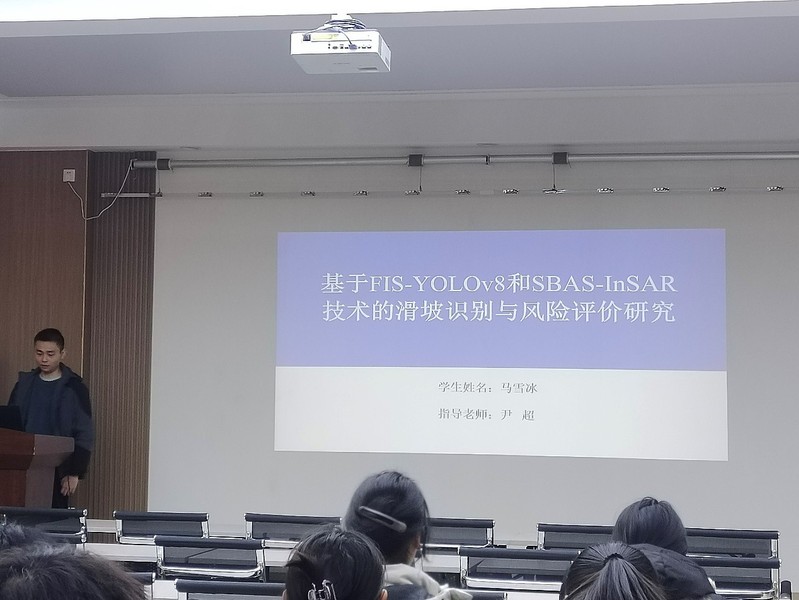 本次学术交流的报告者分别是二年级的马雪冰、孙明凯、胡瑞雪和张志豪。报告主题涵盖了多个前沿研究方向,主要包括:“基于FIS-YOLOv8算法的滑坡识别研究”“粉煤灰-纳米偏高岭土复合水泥砂浆在干湿循环作用下断裂性能的研究”“士工膜替代屋面板温度筋的性能研究”以及“融合多源数据的电离层TEC经验模型研究”。四位同学深入分享了各自的研究成果和学术思考,现场气氛活跃,互动交流充分。