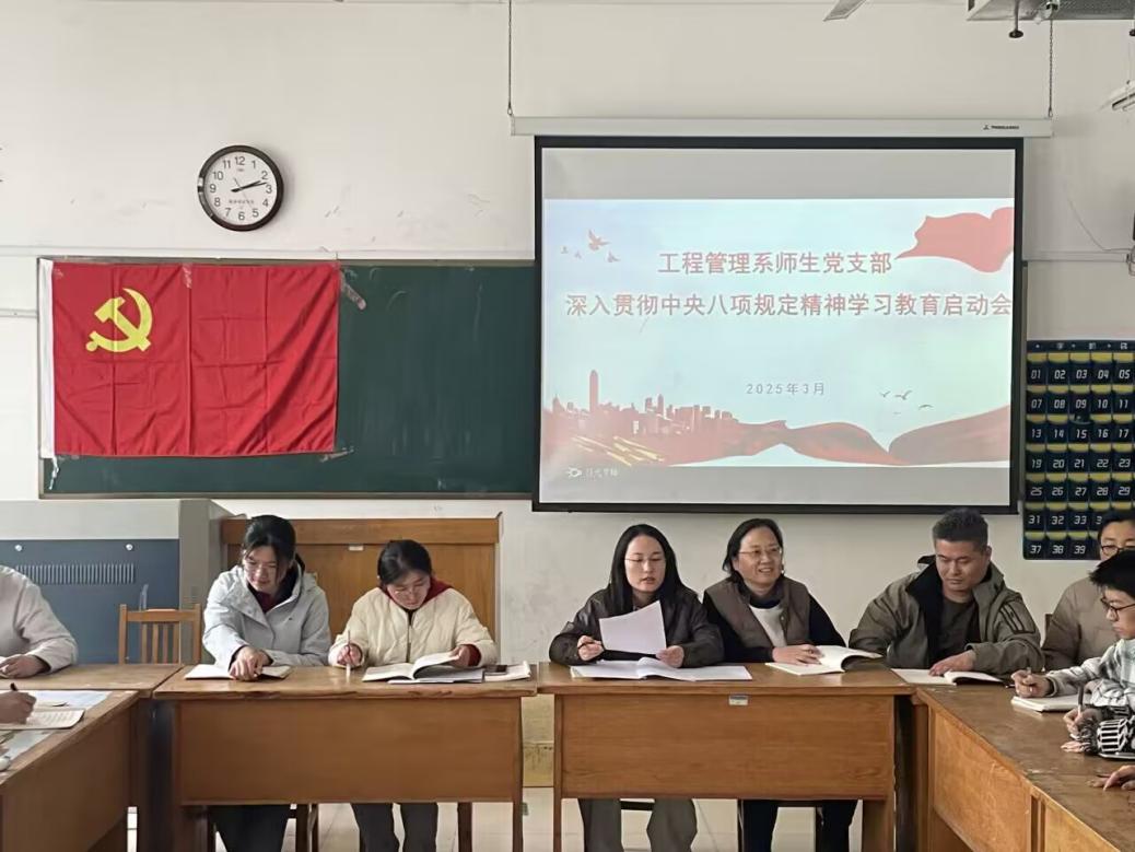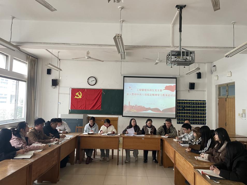 3月27日,为全面落实中央八项规定精神,进一步加强党员干部作风建设,工程管理系师生党支部组织召开“深入贯彻中央八项规定精神学习教育动员会”。会议由支部书记刘爱芳主持,全体党员参加会议,正式启动为期四个月的专题学习教育活动。