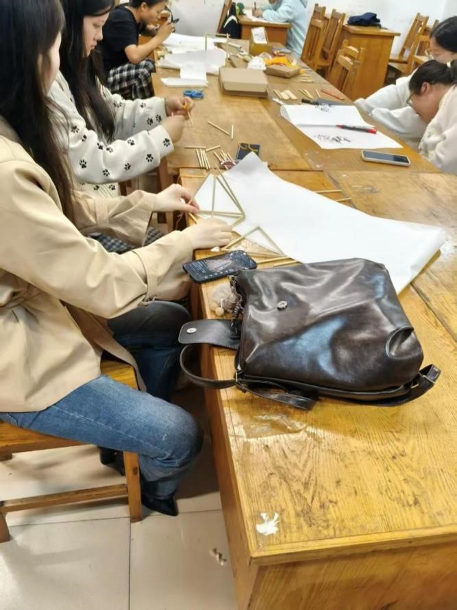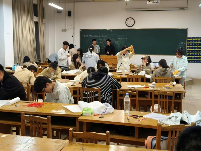 活动现场热闹却有序,同学们分散在教室的课桌旁,各自投入灯笼制作的不同环节。这边,几位同学正围在一起讨论骨架结构,竹篾在指尖灵活弯折,不一会儿就搭出了八角形的灯笼轮廓;那边,有人伏案在灯笼纸上细细描绘,毛笔蘸取金粉,将“花好月圆”的字样勾勒得格外精致;还有同学穿梭在桌椅间,为大家递送剪刀、胶水等工具。从竹篾拼接的“骨架工程”,到灯纸绘制的“美学创作”,再到组装成型的“收尾环节”,同学们在一步步的手工实践中,暂时抛开课程的压力,让思绪沉浸在“慢制作”的节奏里。