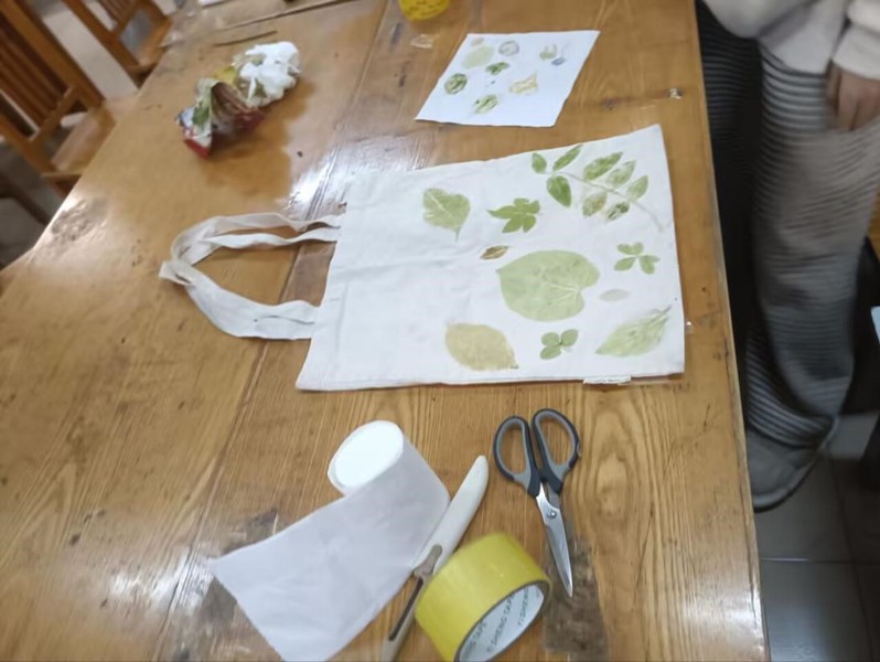 活动现场组织有序,流程兼具实操性与自然意趣。工作人员提前布置好签到区与物料发放处,待参与者签到后,逐一发放素色方巾、明矾水、拓染锤、胶带、专用纸巾等工具包,并详细讲解核心注意事项:重点说明明矾水浸泡叶片的固色作用,明确浸泡时长控制在5-8分钟,特别叮嘱敲击环节需前往室外指定区域完成,避免教室内声音过大影响他人。此次活动的叶片预处理环节充满野趣,同学们将提前采摘的枫叶、梧桐叶、三叶草及各类不知名杂草取出,先用纸巾仔细擦干表面露水与泥土,再小心放入盛有明矾水的容器中浸泡。等待过程中,大家相互展示独特的草叶素材,交流选材心得,部分同学还根据叶片厚薄、纹理疏密调整浸泡时间,确保叶脉与草茎能充分吸收明矾水,为后续拓印效果筑牢基础。浸泡完成后,同学们携带沥干水分的叶片、方巾与拓染锤,有序前往三楼廊桥开展核心创作。指导者现场示范标准流程:将叶片或草叶背面朝上平铺在方巾上,用胶带沿边缘固定防止移位,随后手持拓染锤从边缘向中心轻敲,力度由浅入深、均匀发力,让自然肌理完整转移。大家迅速投入创作,有的专注拓印三叶草的对称纹路,有的用杂草与阔叶搭配拼接出层次感画面,廊桥上不时响起轻柔的敲击声与欢快的交流声。工作人员全程巡回指导,针对纹理模糊、颜色不均等问题,及时建议调整敲击力度或补充浸泡步骤,助力大家将提前采摘并经明矾水处理的自然素材,转化为独一无二的方巾拓印作品。现场完成的帆布包作品尤为亮眼:以阔叶作主体、三叶草为点缀,大小错落的自然肌理浅印于布面,浅绿淡黄的植物原色衬出质朴秋意,实用又藏着独属的手工温度。